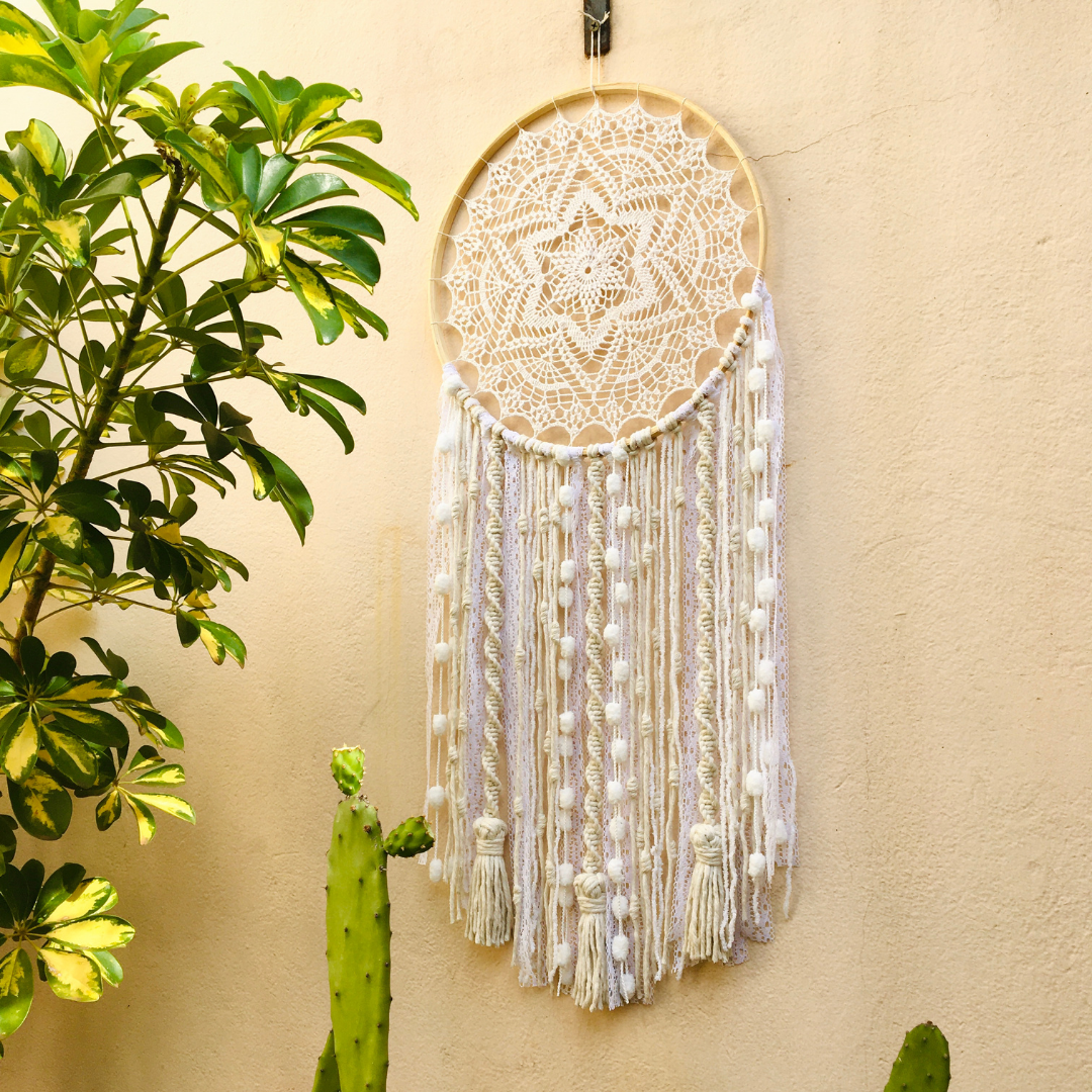 Base da peça feita em aro de bambu. Trama em linha de algodão e tassels em barbante de algodão ecológico, pompom fofo, rendas, fitas e lãs.