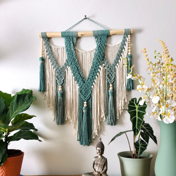 Neste painel, usei dois tons de verde, o alecrim e o esmeralda, junto com o cru para harmonizar! E como um toque especial, as contas em madeira!